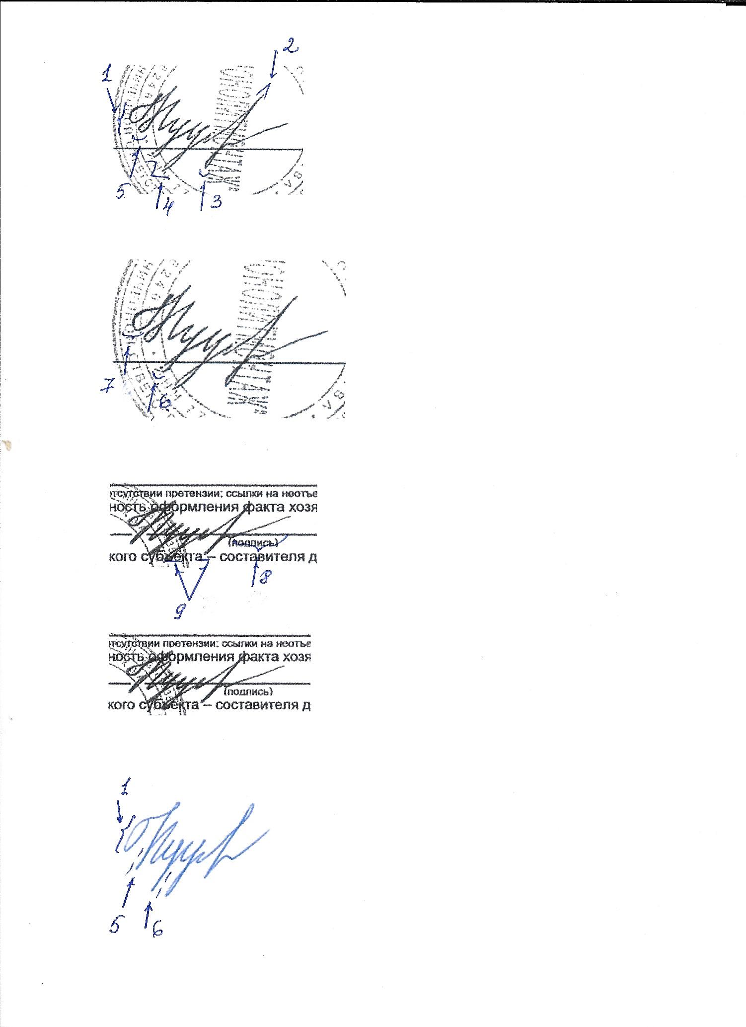 - Свободные образцы подписи: четыре листа белой бумаги формата А4, содержащие образцы подписи, выполненные красящим веществом фиолетового цвета.