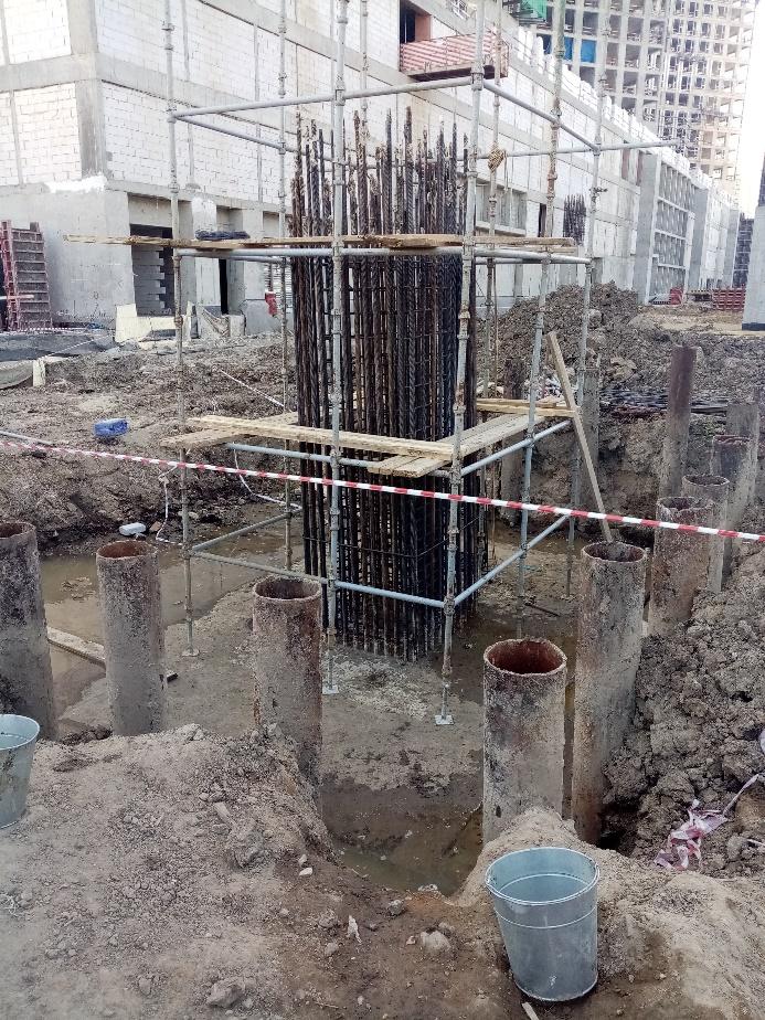 Объектами исследования являлись конструкции, составляющие фундаментную часть Высотно-Градостроительных комплексов. Эти элементы представляют собой массивные железобетонные буронабивные сваи диаметром 1200 мм, служащие основой для свайных опор различных секций комплекса. Особенностью объектов является их частичная скрытность, поскольку на момент проведения экспертизы на большинстве свай уже были возведены ростверки и, в некоторых случаях, стойки опор, что ограничивало прямой доступ к телу свай и усложняло визуальное обследование.