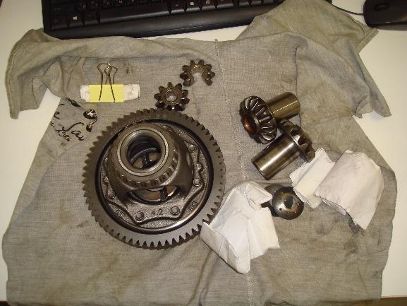 - Составные части дифференциала: корпус, опорные шайбы сателлитов, ось сателлитов, сателлиты, стопорный штифт, шестерни полуосей