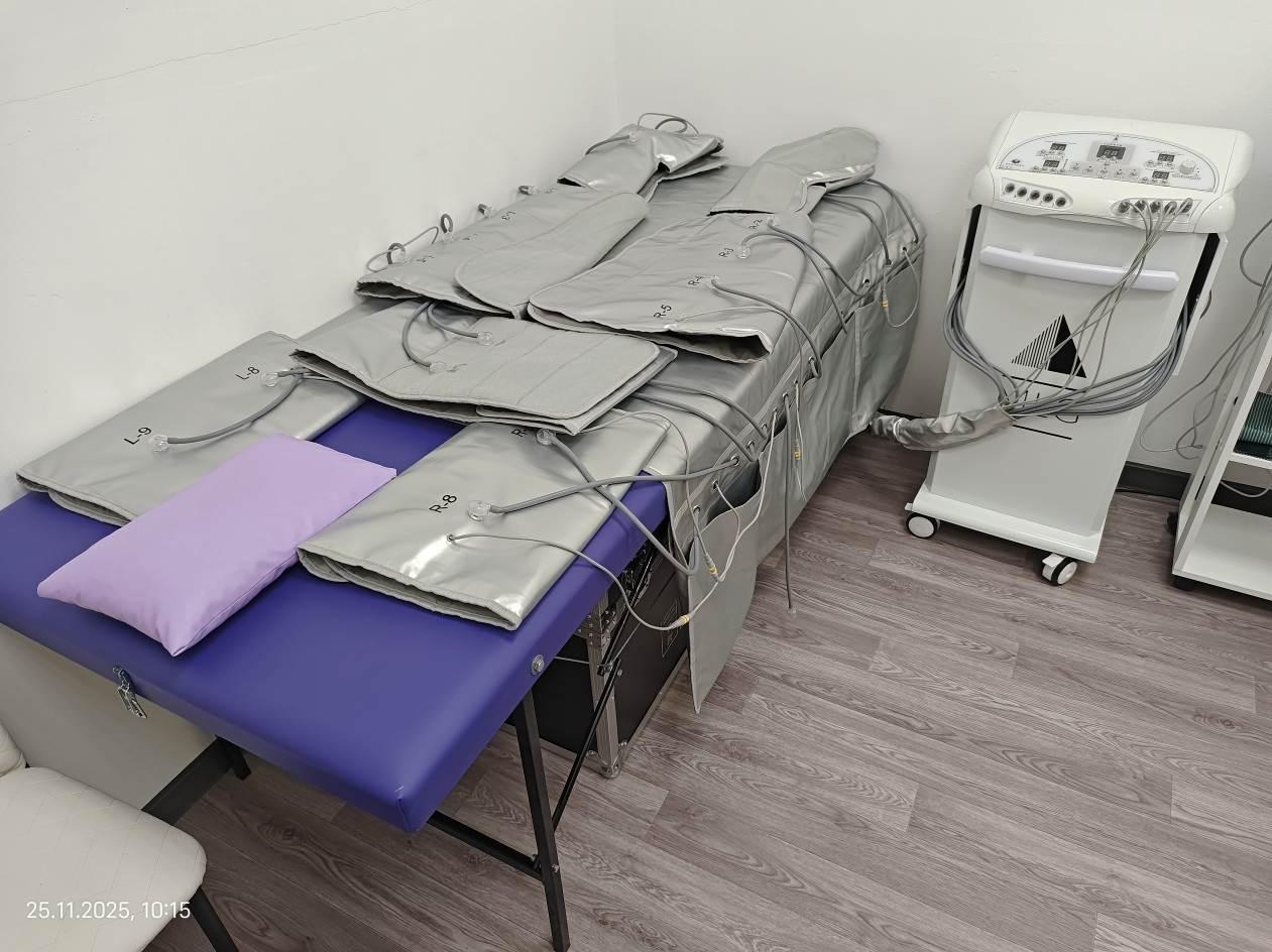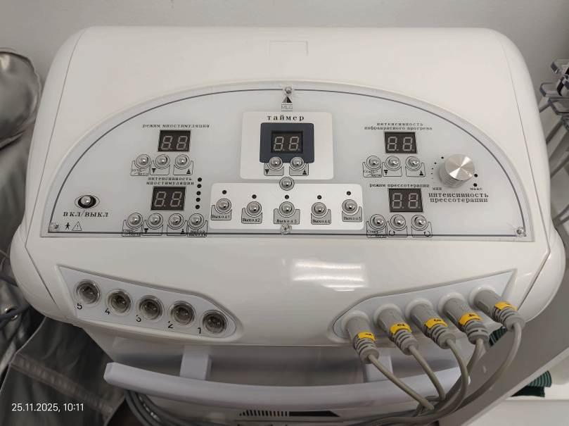 - Аппарат прессотерапии 3 в 1 MLG, серийный номер аппарата не указан на корпусе, идентифицирован по логотипу MLG на лицевой панели. Оборудование имеет функции прессотерапии (использование сжатого воздуха), миостимуляции (низкочастотные электрические импульсы) и инфракрасного тепла. Внешнее состояние аппарата было оценено как близкое к новому, однако имели место признаки воздействия инструмента на крепежные элементы.