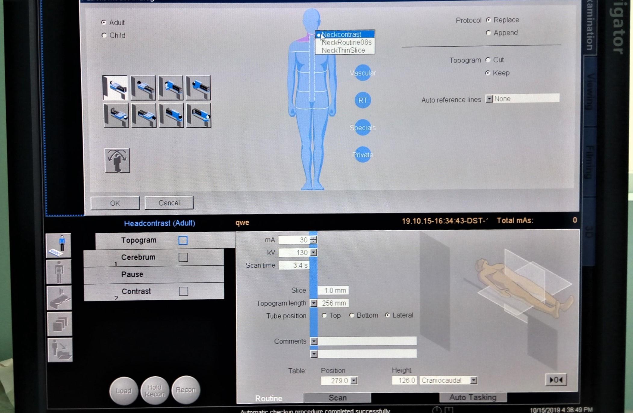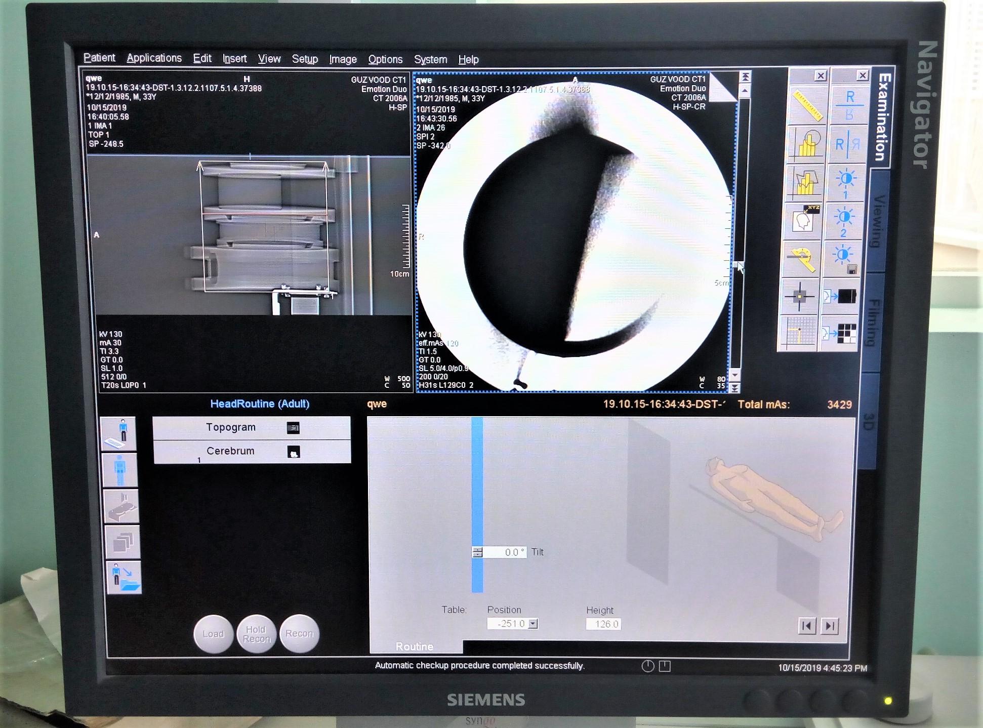 - Компьютерный спиральный Томограф Somatom Emotion Duo производства фирмы Siemens. Это высокотехнологичное изделие обеспечивает удобную и производительную визуализацию анатомических объемов сканирования, позволяя проводить скрининговые обследования, виртуальную эндоскопию, перфузию. Аппарат обеспечивает высокое качество изображения, минимальную лучевую нагрузку на пациента и оснащен эффективной воздушной системой охлаждения.